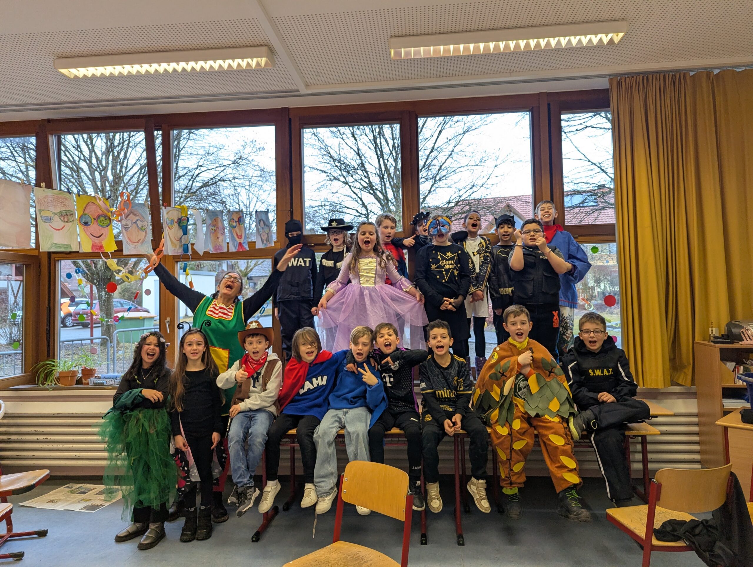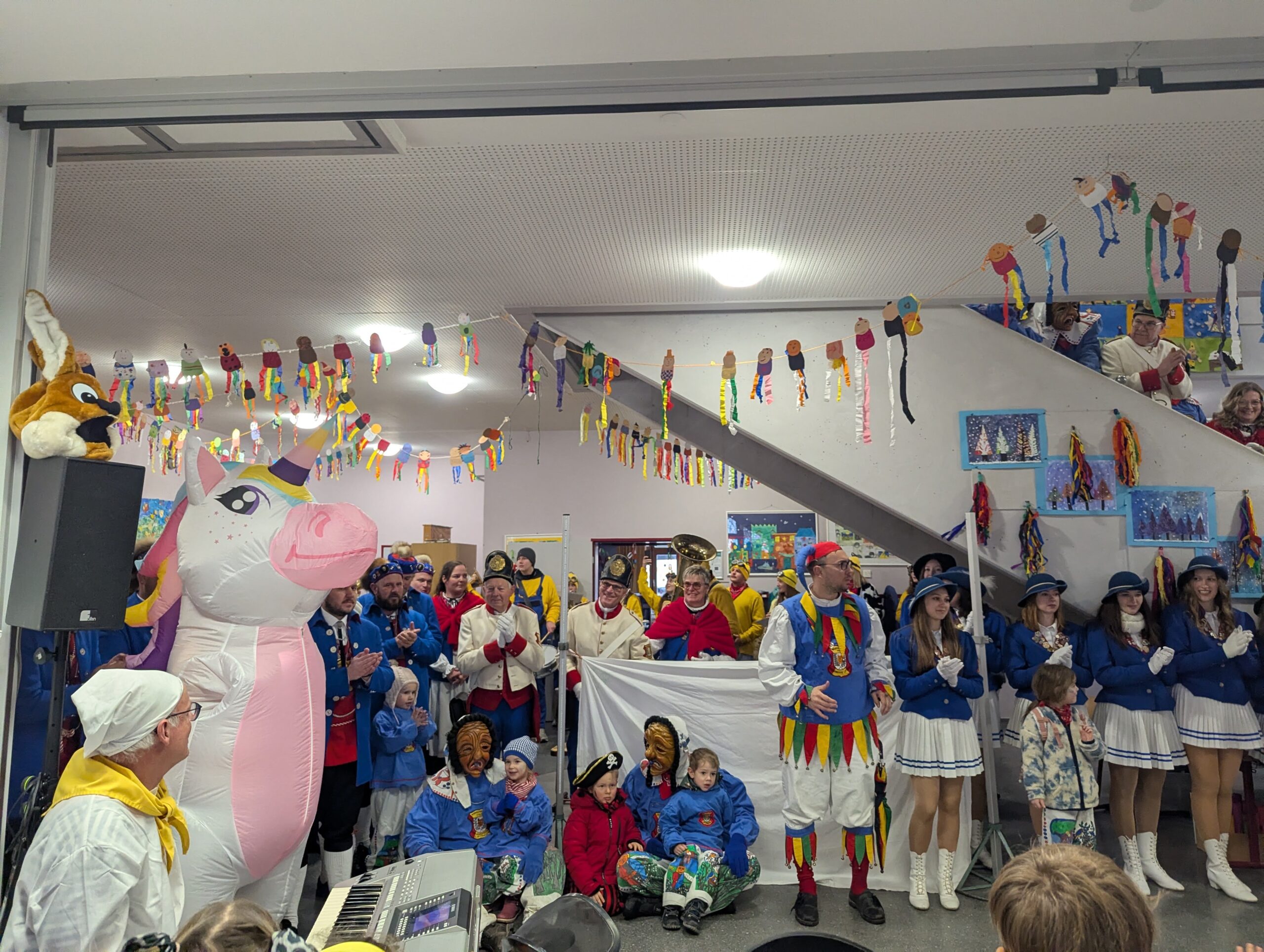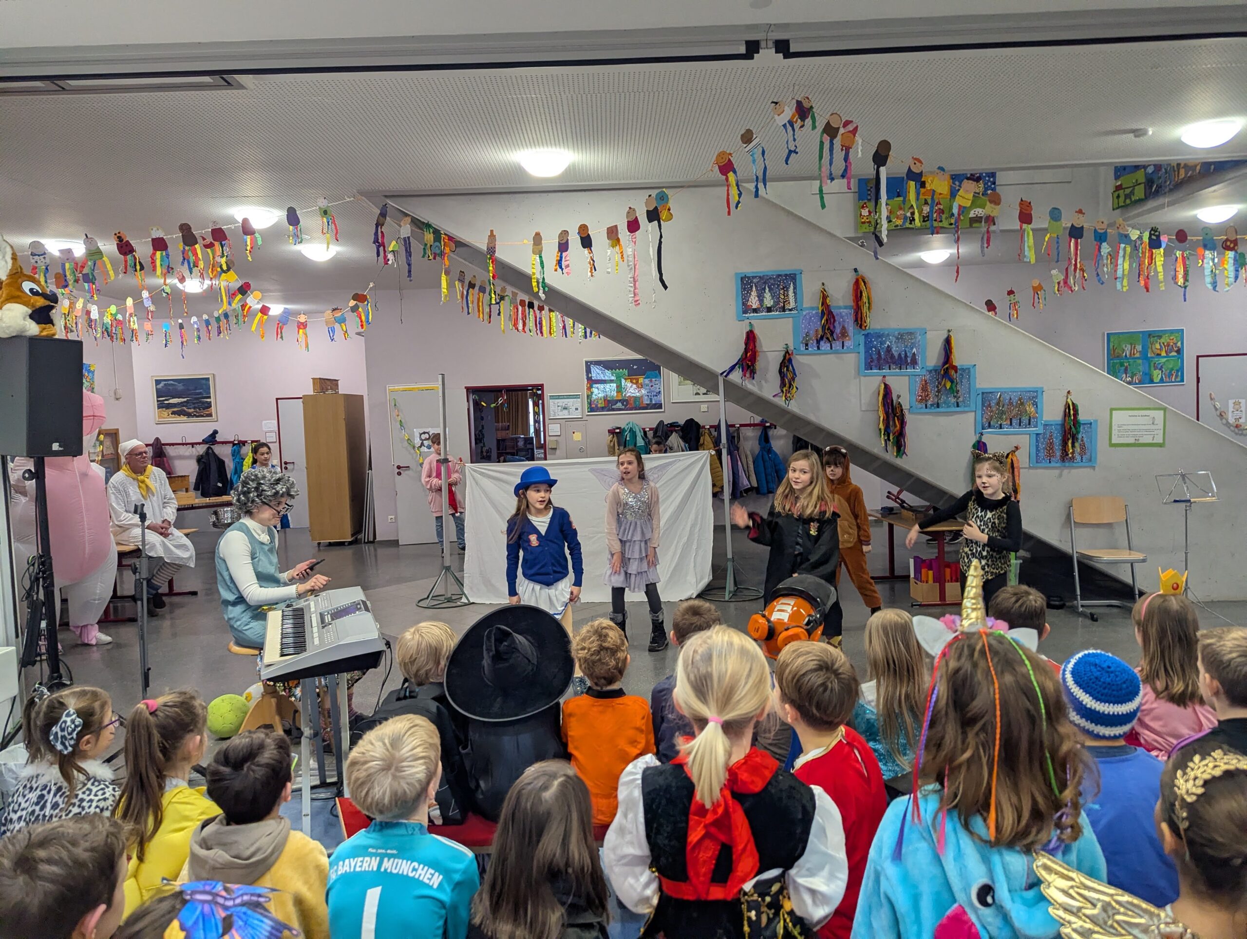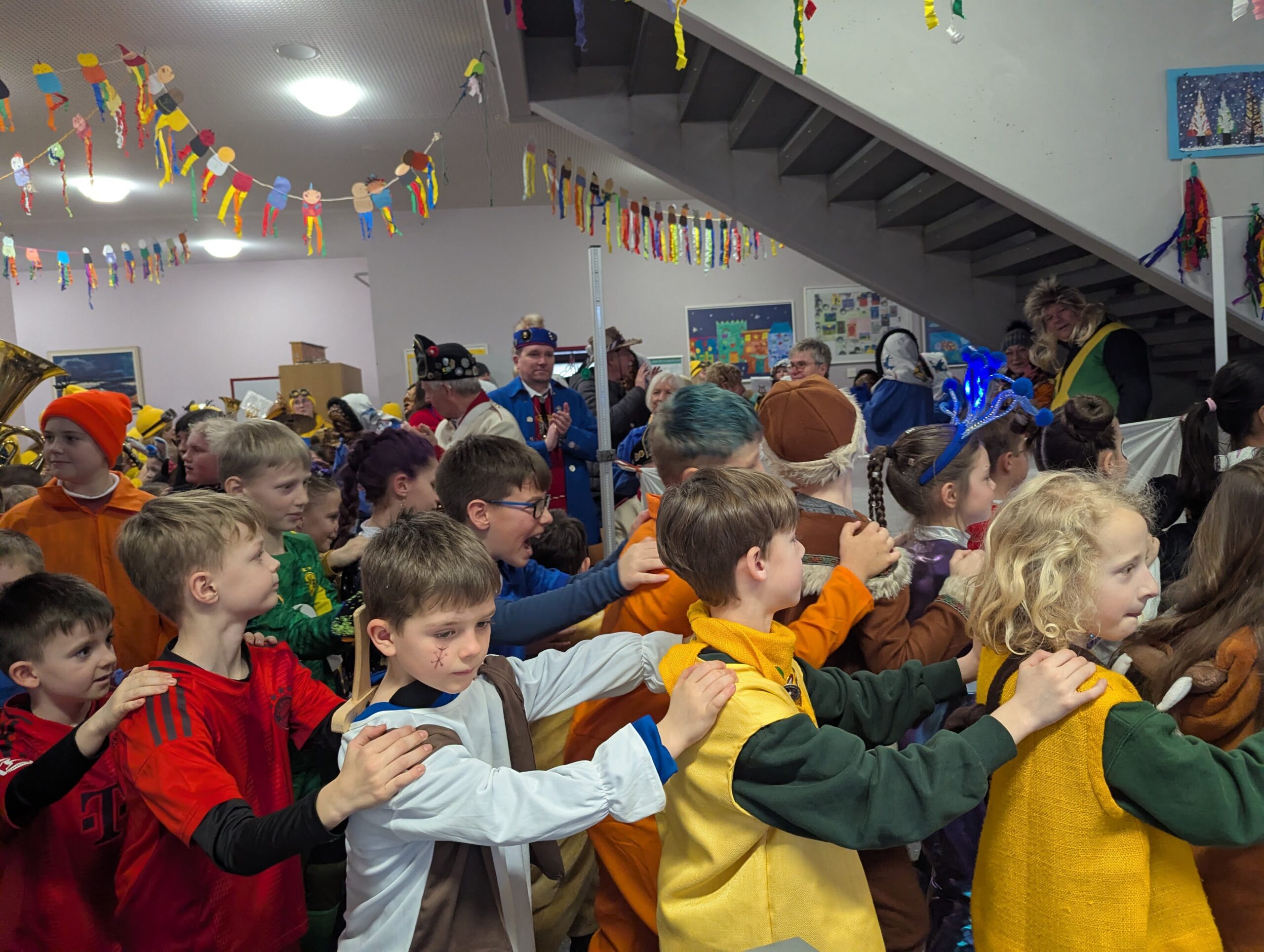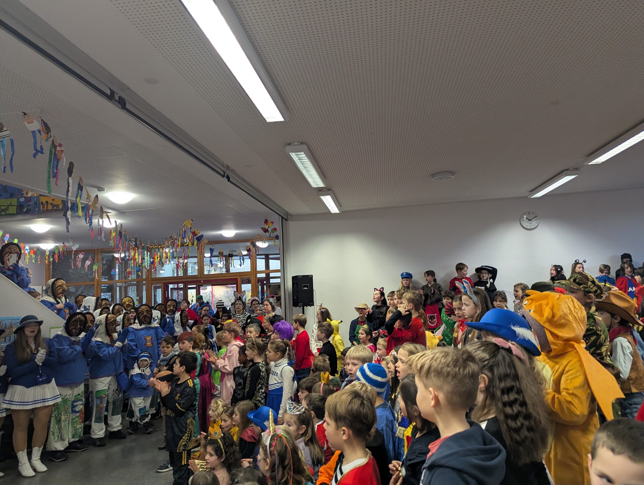 Am Donnerstag, 12.02.2026 haben auch wir an der Grundschule Fasnet gefeiert. Alle Schüler und Lehrer kamen in bunten und verrückten Kostümen. Nach einem individuellen Programm im jeweiligen Klassenzimmer holte uns der Schulleiter Herr Endres mit einer riesigen Polonaise, die in unserer Aula endete, ab. Auch hier führten manche Klassen und die Orff-AG etwas vor und gemeinsam wurden die Narrenmärsche gesungen. Als die Schlehenbeißer mit dem Musikverein die Schule stürmten, waren die Schüler (und Lehrer) froh, vom Unterricht befreit zu sein. Viele gingen anschließend zum Narrenbaumaufstellen und starteten so in ihre Fasnetsferien.