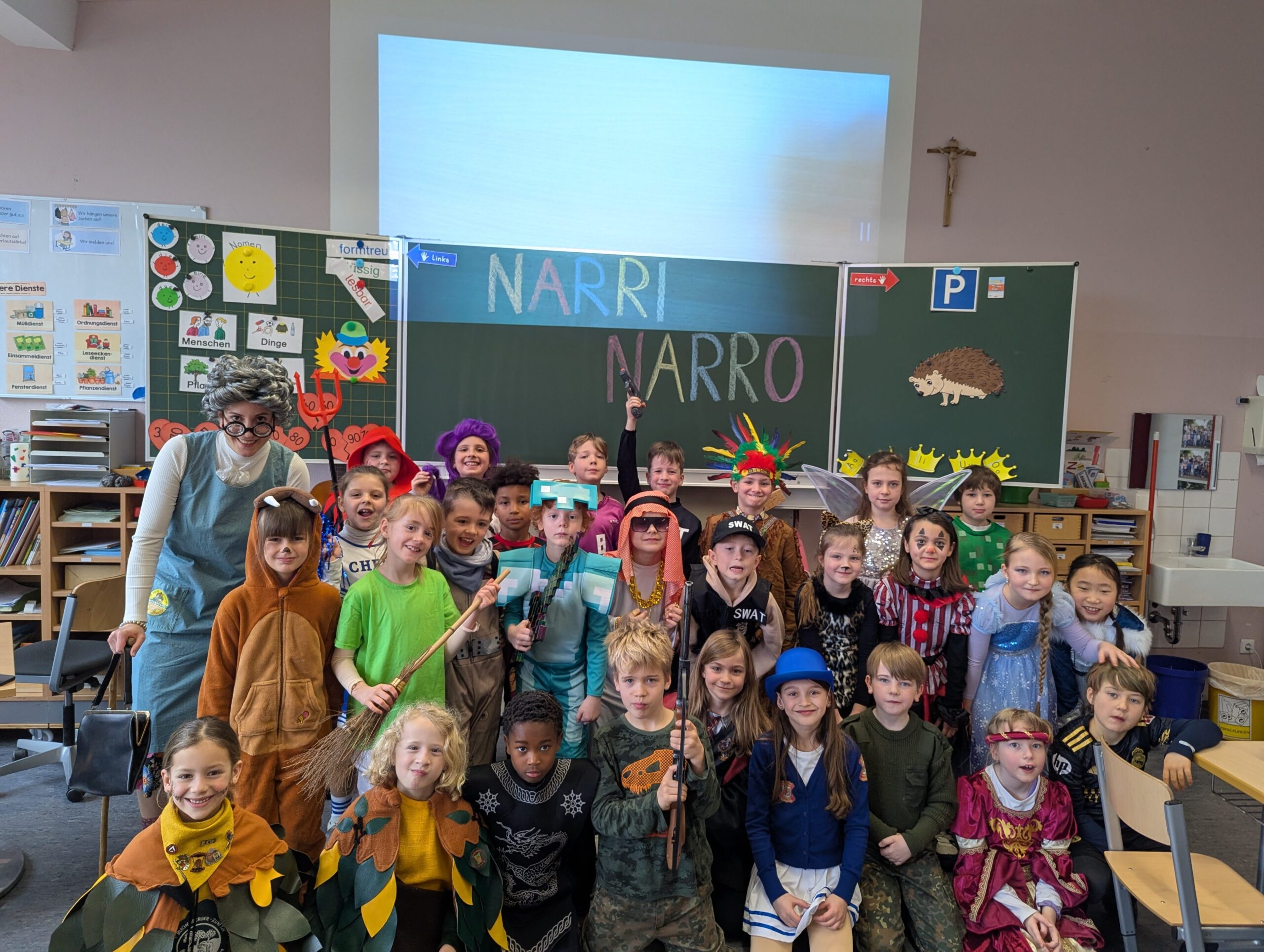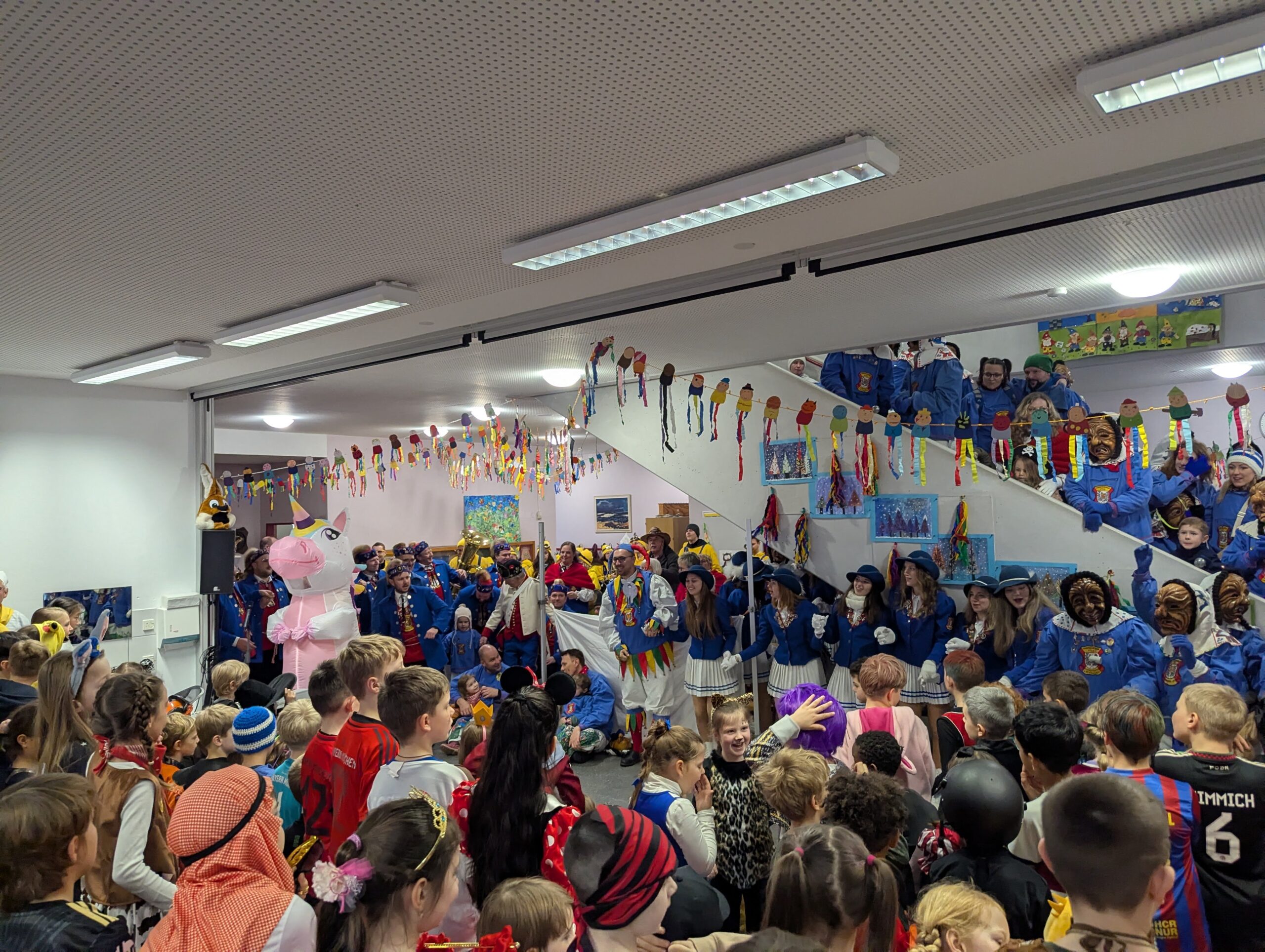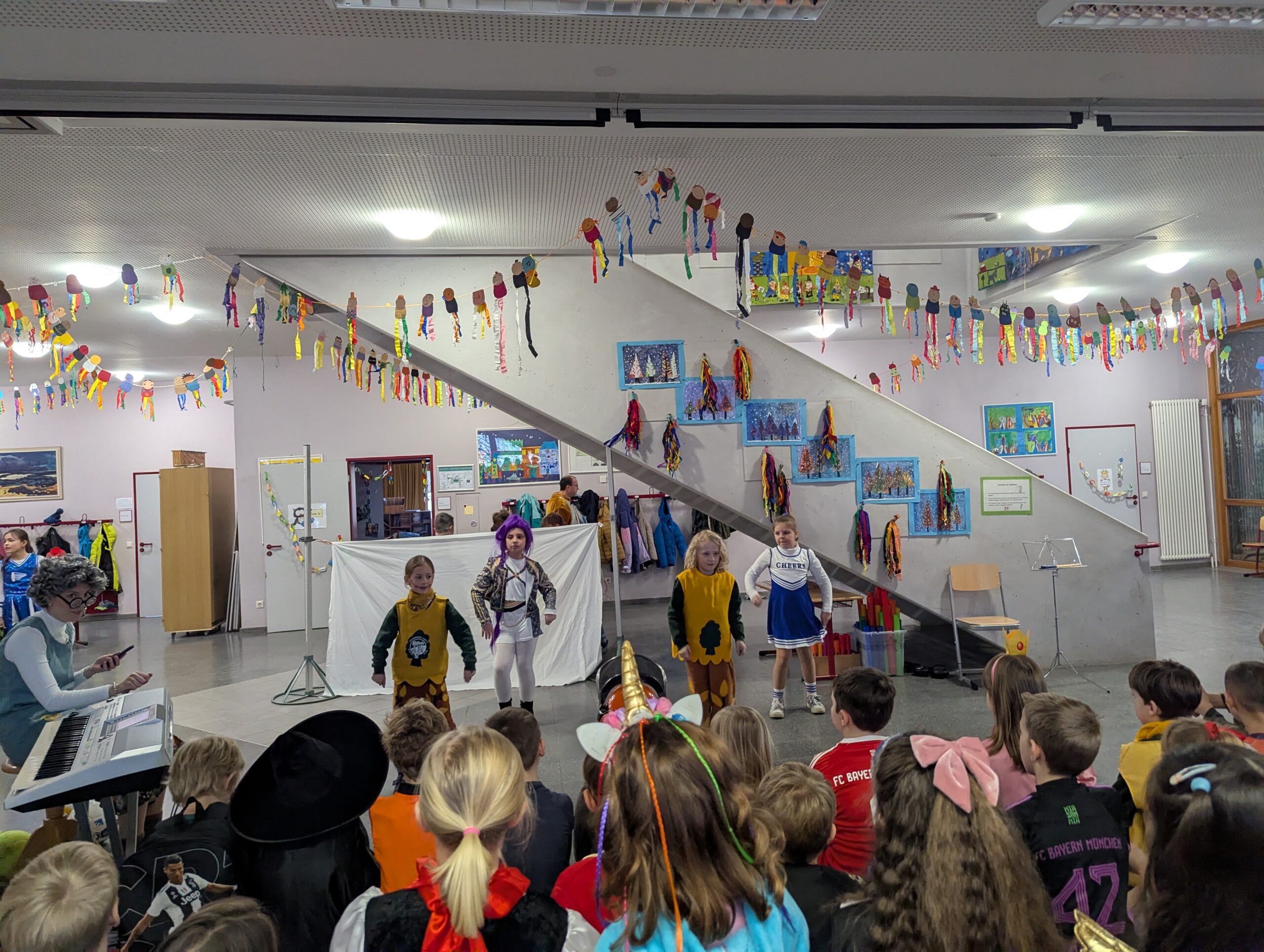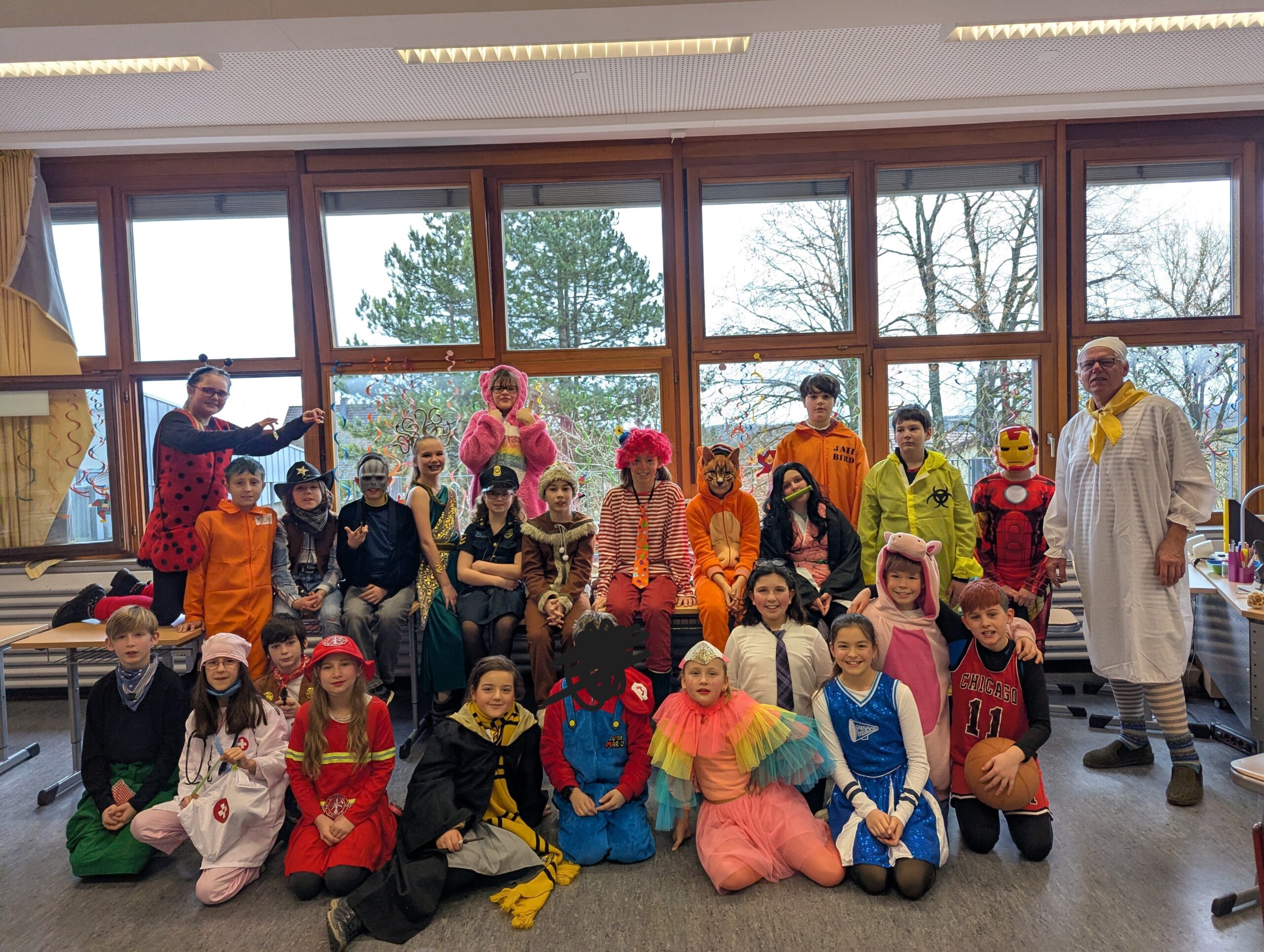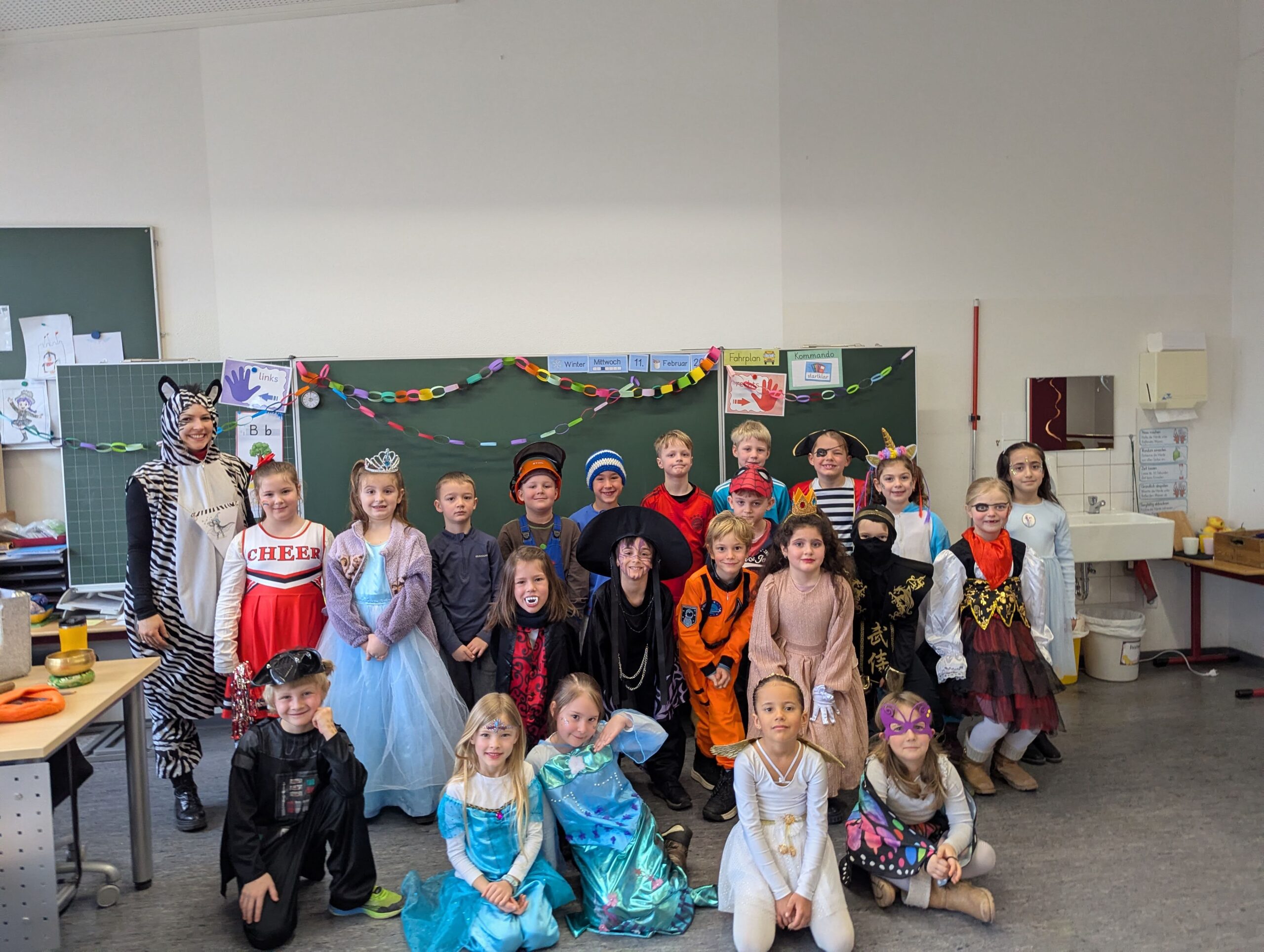 Am Donnerstag, 12.02.2026 haben auch wir an der Grundschule Fasnet gefeiert. Alle Schüler und Lehrer kamen in bunten und verrückten Kostümen. Nach einem individuellen Programm im jeweiligen Klassenzimmer holte uns der Schulleiter Herr Endres mit einer riesigen Polonaise, die in unserer Aula endete, ab. Auch hier führten manche Klassen und die Orff-AG etwas vor und gemeinsam wurden die Narrenmärsche gesungen. Als die Schlehenbeißer mit dem Musikverein die Schule stürmten, waren die Schüler (und Lehrer) froh, vom Unterricht befreit zu sein. Viele gingen anschließend zum Narrenbaumaufstellen und starteten so in ihre Fasnetsferien.