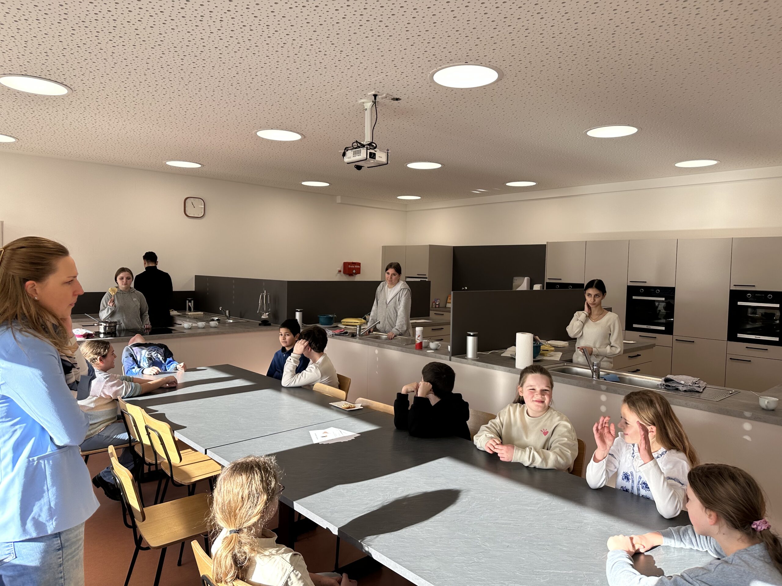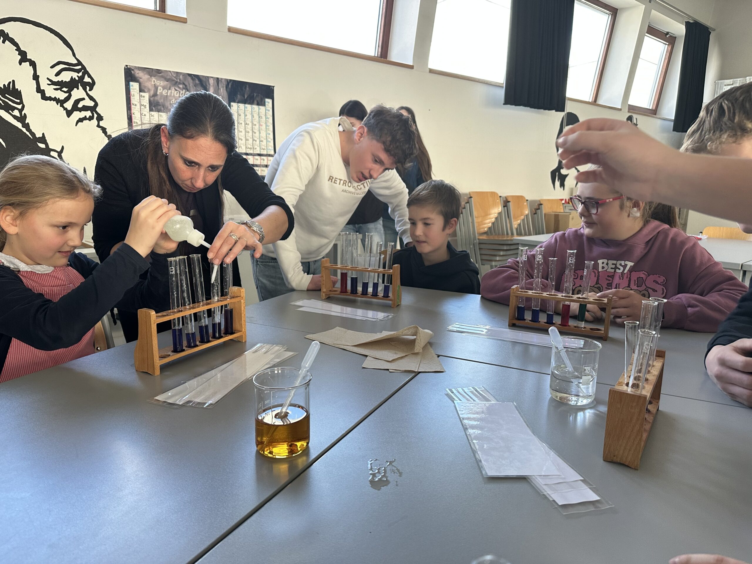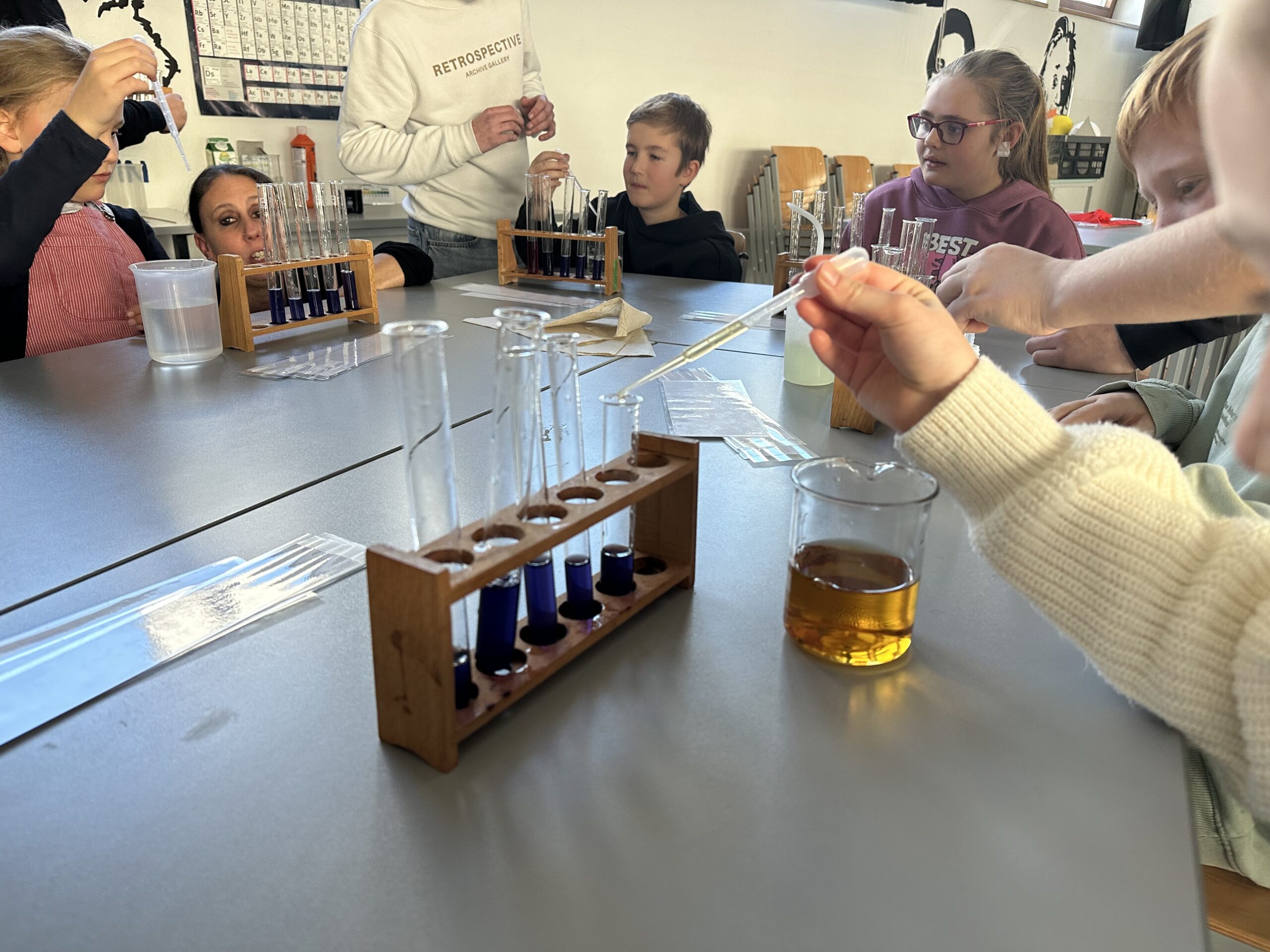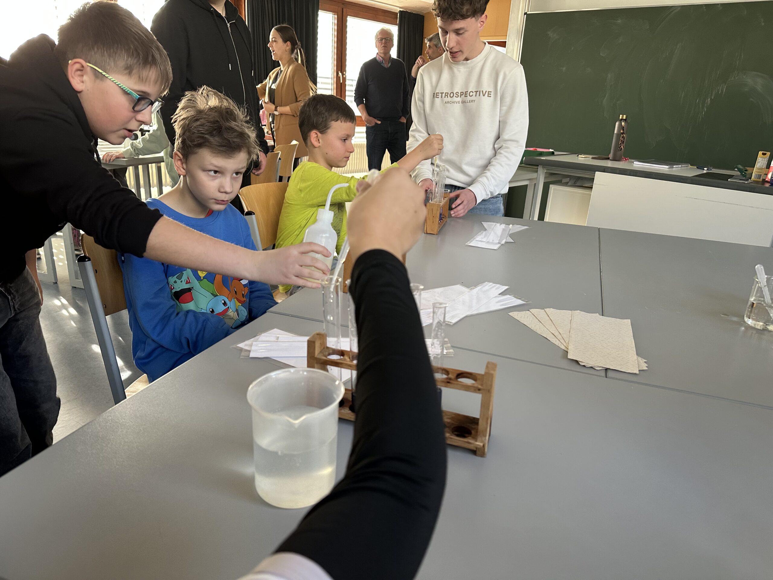 Am vergangenen Dienstag fuhren die beiden vierten Klassen mit ihren Klassenlehrern Herr Klaus und Frau Spieler mit dem Bus von Liptingen nach Emmingen an die Witthohschule. Dort nahm sie der Schulleiter Herr Finkbeiner in Empfang und erklärte den Ablauf des Vormittags. In Kleingruppen aufgeteilt wurden die Grundschüler von den Achtklässlern durch das Schulhaus geführt. In den verschiedenen Klassenzimmern waren von weiteren Klassenstufen Stationen und Aktionen für die Kinder aufgebaut. In der Küche durften Waffeln verziert werden, im Werkraum wurden Schlüsselanhänger aus Holz hergestellt, in Englisch gab es ein Karnevalheft und in Chemie durften Experimente mit sich färbenden Flüssigkeiten gemacht werden. Nach den eindrucksvollen Stunden fuhren die Viertklässler voller Begeisterung wieder mit dem Bus zurück. Vielen Dank an alle Lehrer und Schüler aus Emmingen, die die Witthohschule vorgestellt und mitgeholfen haben!